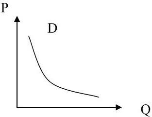Между ценой на товар и величиной спроса на него существует отрицательная, или обратная, связь, которую называют законом спроса. При прочих равных условиях снижение цены ведет к соответствующему возрастанию величины спроса, и наоборот. Эту зависимость можно выразить графически. Если на оси абсцисс обозначить количество товара Q, а на оси ординат – движение цены P, то получится нижеследующий график.