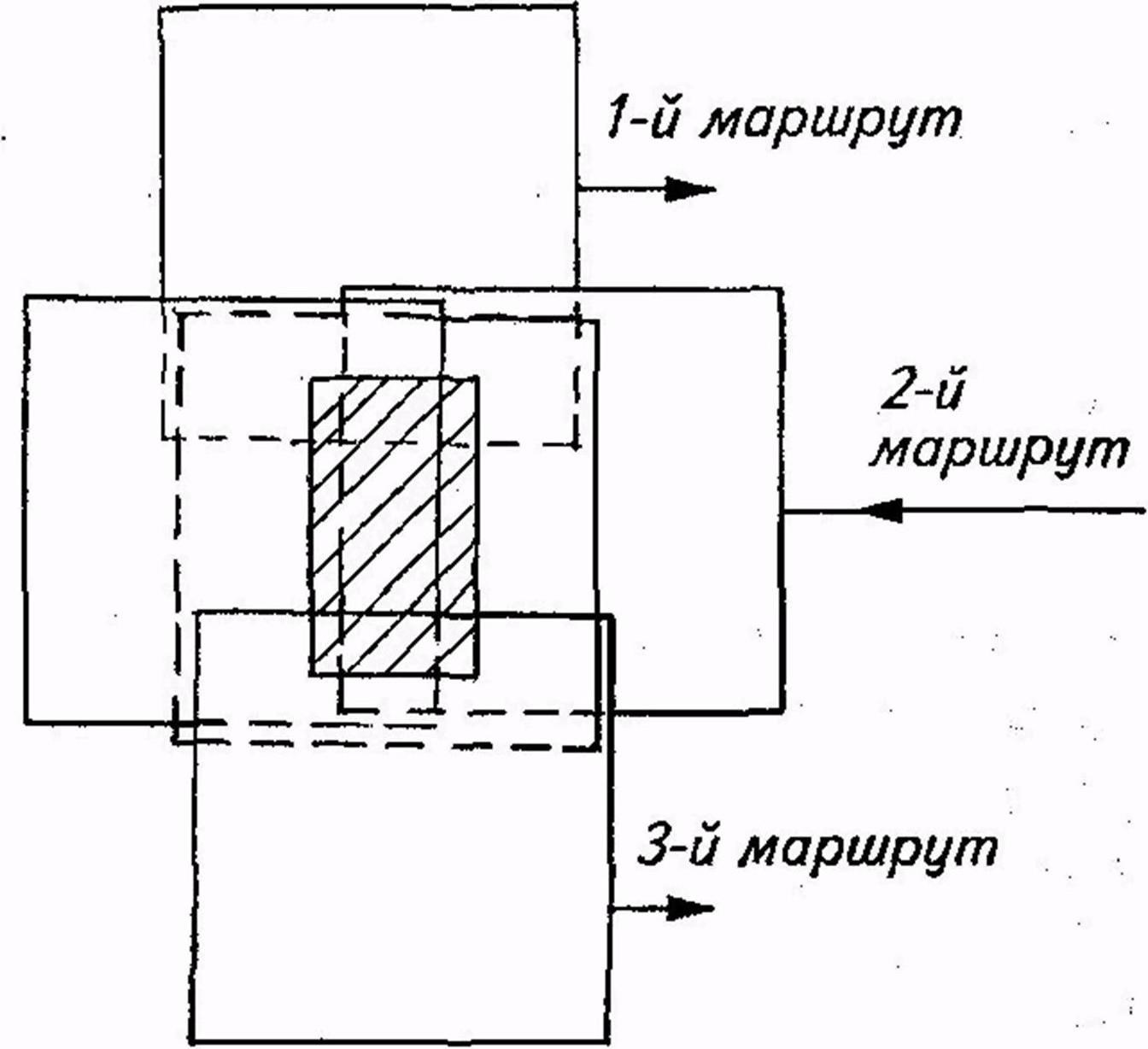 Монтаж второго маршрута также начинают с правого крайнего снимка, укладывая его по общим точкам поперечного перекрытия с аэрофотоснимками предыдущего маршрута.