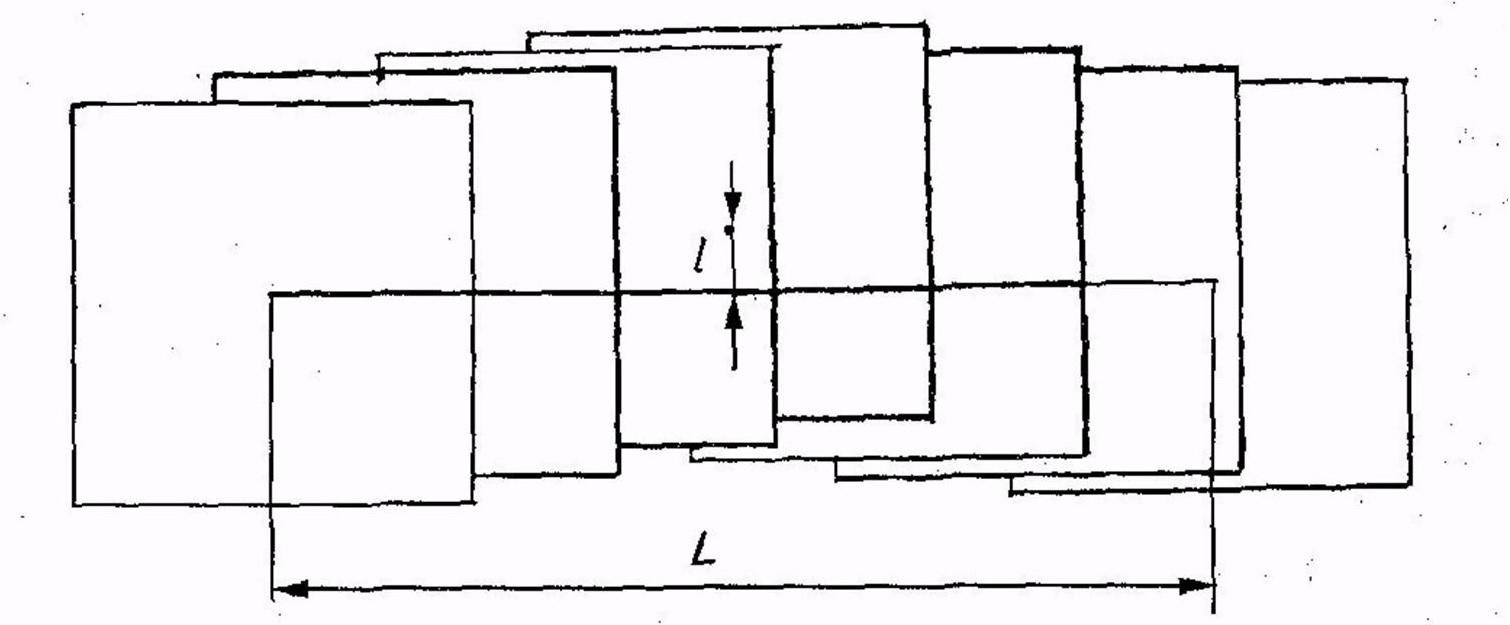 2. Непрямолинейность аэрофотосъемочного маршрута. Для ее определения сначала находят главные точки крайних снимков маршрута, за которые принимают пересечение линий, соединяющих противоположные координатные метки. Затем их соединяют прямой линией, измеряют расстояние L между ними (рисунок 7) и уклонение от этой прямой главной точки наиболее удаленного снимка. Это уклонение называют стрелкой прогиба маршрута.