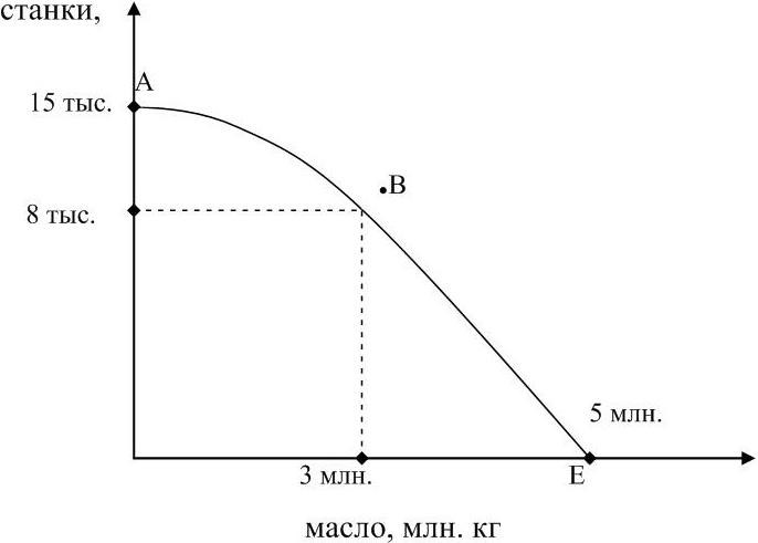 Соединив точки А и Е, получим кривую производственных возможностей. Она говорит о том, что общество должно выбирать между станками и маслом путем перераспределения ресурсов. В данном варианте мы видим, что можно произвести 8 тыс. шт. станков и 3 млн. кг масла одновременно из наличия имеющихся ресурсов.