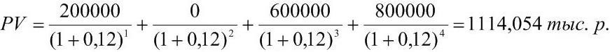 Пример – Рассчитайте суммарную текущую стоимость денежных потоков, возникающих в конце года, если ставка дисконтирования равна 12 %. Денежные потоки по годам составили: первый год – 200 тыс. р.; второй год – 0; третий год