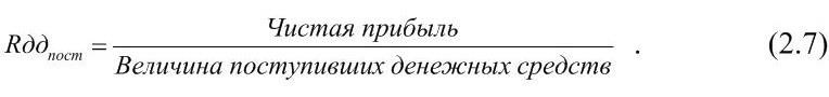 – рентабельности денежных поступлений по формуле (2.7)