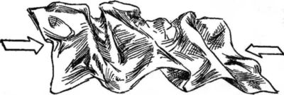 Выветривание и размывание — это разрушительные силы, выравнивающие поверхность Земли, Если бы на нее не действовали другие силы, весь мир был бы плоским, так как горы и холмы были бы разрушены за несколько миллионов лет. Однако работают и восстанавливающие силы, которые медленно, но постоянно изменяют поверхность Земли. Внутренние части Земли все время находятся под высоким давлением, так как на них давят вышележащие наружные слои. Иногда это давление уменьшается в одном месте или увеличивается в другом (рис. 8).