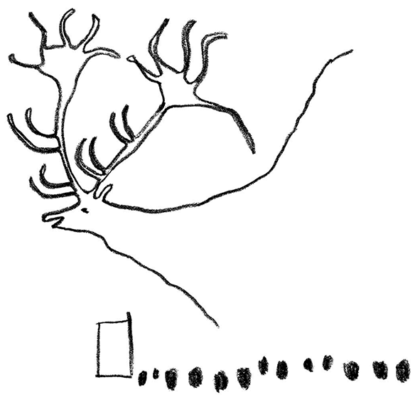 Одну из таких групп точек обычно считают изображением звездного скопления Плеяды. Появление этого скопления в ночном небе отмечало во многих древних культурах начало года. Проходя по пещере, я подошел к последовательности из тринадцати точек, на одном конце которой нарисован прямоугольник. Выше прямоугольника находится огромное изображение оленя в период гона. Дальше по стене есть серия из 26 точек, в конце которой нарисована огромная стельная корова.