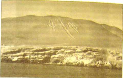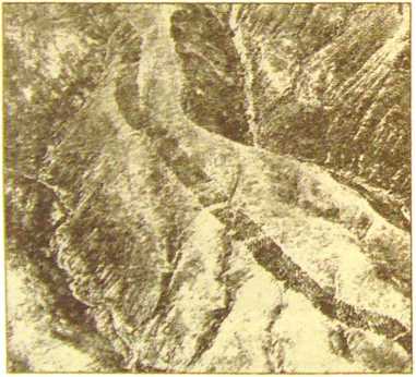 Именно в работе Р. Шиппи, опубликованной в 1933 году, был впервые напечатан снимок удивительной полосы (рис. 4), тянущейся на милю вверх от долины Писко по неровному ландшафту горы. На первый взгляд этот след напоминает отпечаток какого-то самоходного устройства, которое спустилось по уклону вниз с горы. Однако вблизи оказалось, что эта полоса состоит из отверстий диаметром примерно один метр и примерно такой же глубины. Восемь отверстий в ряд охватывают ширину "перфорированной ленты" в 20–24 метра. Отверстия выбиты, пробуравлены в каменистом грунте и кажутся упорядоченными ряд за рядом в шахматном порядке. Изредка встречаются более мелкие отверстия, как будто не законченные, хотя рядом с ними расположены другие, полной глубины. Хотя эти странные отверстия явно имеют древнее происхождение, местные жители не имеют понятия, кто их сделал и для чего. Более того, никто не обращал внимания на этот странный след, пока их не заметили с воздуха.