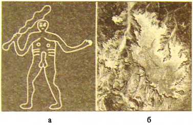 Рис. 3. Два гигантских изображения человека, обнаруженные в противоположных концах света: а — "английский человек" создан путем очистки мелового грунта от растительности; б — "австралийский человек" — изображение на фунте пустыни фантастического размера в 4 км. По масштабам и контурному стилю рисунки напоминают насканские, но они не механистичны, отражают и род занятия, и динамику движения, то есть наполнены содержанием