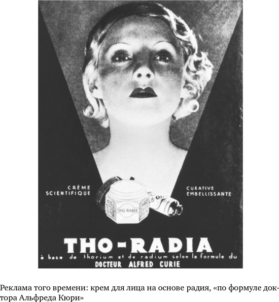 …Эта история началась в 1898 году в Париже, когда Мари Склодовская-Кюри открыла радиоактивные элементы торий, полоний и радий, а затем исследовала их свойства. К 1904 году врачи стали использовать радиевые соли для лечения злокачественных опухолей («радиевая терапия»). Казалось, найдено чудо-вещество. Последним писком моды стали радиевая вода, радиевая сода, радиевые кремы, радиевая пудра и радиевое мыло. Рекламные щиты сияли радиолюминесцентными красками, исцеляющими тело и душу…
