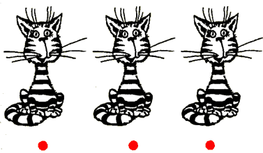 Каждая точка обозначает одну кошку. Покажите ребенку, что точки могут символизировать любой предмет: деревья, человечков, дома. Потом положите перед ним несколько фасолин и предложите нарисовать столько точек, сколько фасолин лежит на столе (большой фломастер позволит малышу рисовать точку, прижимая стержень к бумаге только один раз; если ребенок еще не может выстроить точки в ряд, нарисуйте их сами под его диктовку). Затем возьмите такое же количество других предметов, например вилок. Пусть малыш нарисует столько точек, сколько вилок он видит. Сравните число точек, изображающих фасолины, и число точек, обозначающих вилки. Заставьте ребенка убедиться, что количество нарисованных точек равно количеству предметов. Так он поймет, что точки могут изображать любые предметы: важно только их число.