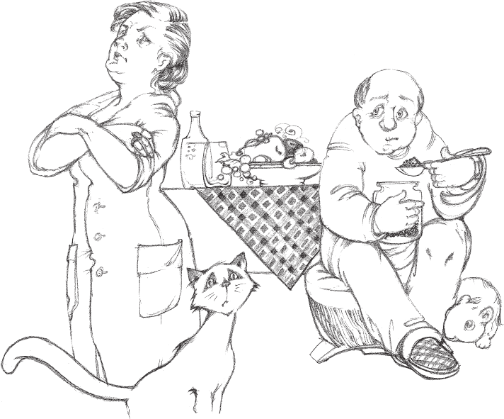 Иду мыть руки, по пути заглядываю на кухню. Зрелище потрясающее: «глава семьи» в майке и трусах сидит верхом на табурете и ложкой прямо из банки ест икру. Литровая банка уже пуста наполовину. При моем появлении Семен Борисович делает судорожный глоток и недоверчиво смотрит на меня грустными глазами затравленной антилопы.
