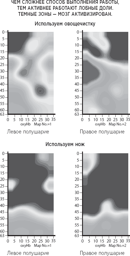 Как видно по результатам, при чистке ножом, то есть более сложным способом, мозг активизируется значительно сильнее. Если мы будем постоянно выбирать более сложные варианты выполнения обычных заданий, это вызовет усталость и раздражение, но если делать это лишь время от времени, эффект будет положительным.