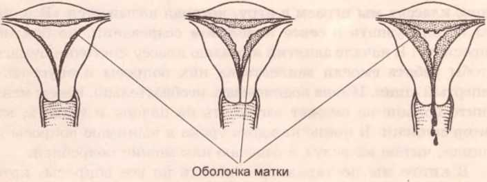 Если оплодотворения не произошло, оболочка матки оказывается ненужной, и поэтому примерно неделю спустя после распада неоплодотворенной яйцеклетки матка выбрасывает эту оболочку. Губчатая, наполненная кровью ткань оболочки сходит со стенок матки, собирается в ее нижней части и вытекает из влагалища (см. рисунок 6).
