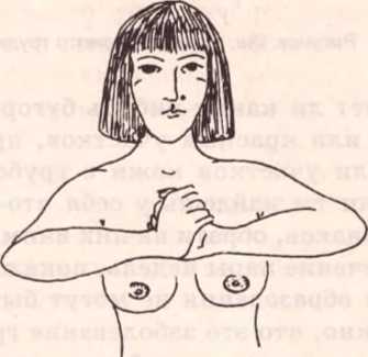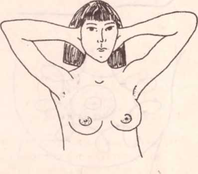 Затем подними руки, согни их в локтях и положи за голову. И снова проверь грудь спереди и с боков на предмет ямочек и бугорков (см. рисунок 13 г).