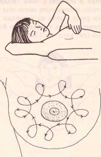 Для начала согни одну руку и положи ее за голову. Свободной рукой, начиная с внешней стороны груди, круговым движением осторожно прощупай каждую грудь (продави ее до грудной клетки). Таким же образом исследуй верхнюю часть груди и участок подмышечной впадины.