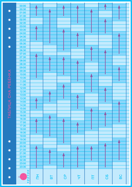 Таблица сна используется для отслеживания, изменения и перепрограммирования графика сна ребенка. На следующей странице приведен образец таблицы для наблюдения за циклами сна на одну неделю. Рекомендуется сделать несколько копий пустой таблицы, приведенной в приложении, и понаблюдать за циклами вашей модели в течение первых нескольких месяцев жизни.