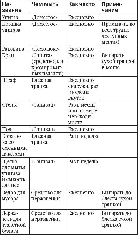 – Правило четвертое. Обязанности уборщиц должны быть точно определены. Для этого заведите специальную тетрадь, в которой будут указаны места пользования – холл, туалет, комната 1, комната 2, прихожая, коридор и т. д. Определите, что и с какой периодичностью должна делать уборщица в каждом помещении. Приведу пример с санузлом.