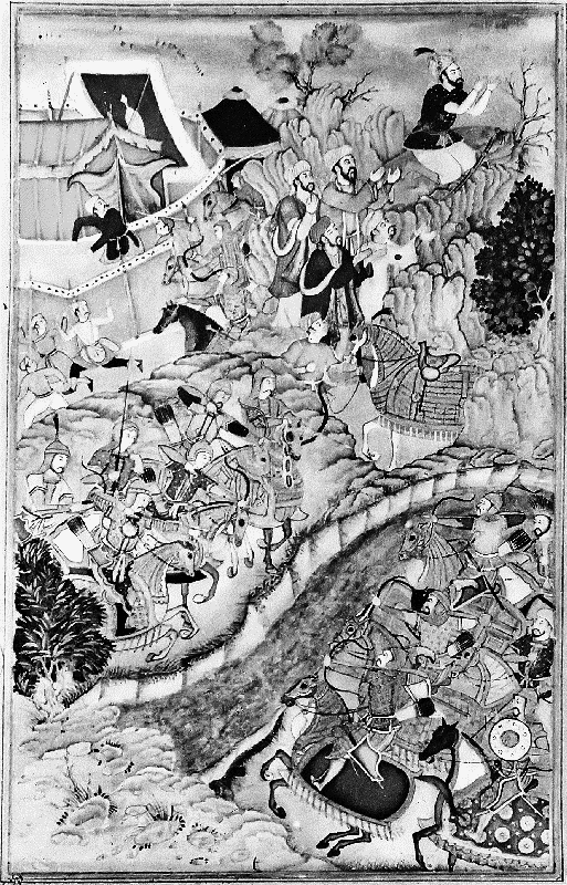 Чингисхан молит Всевышнего Тэнгри о помощи в предстоящем походе против Империи Цзинь. Иллюстрация к «Сборнику летописей» Рашид ад-Дина. Индийская художественная школа. Эпоха Великих Моголов, XVI в.