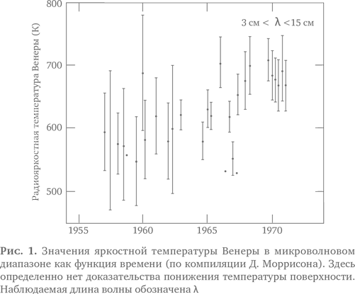 Великовский неоднократно утверждает, что Венера со временем остывает. Как мы уже видели, он приписывает ее высокую температуру нагреванию от Солнца во время прохождения поблизости от него. Во многих своих работах Великовский сравнивает опубликованные значения температуры Венеры, полученные в разное время, и пытается показать желаемое охлаждение. Объективно воспроизведенные значения яркостной температуры Венеры в микроволновом диапазоне – единственные данные, полученные не из космоса, которые имеют отношение к температуре поверхности планеты – представлены на рис. 1. Погрешности представляют собой неточности процессов измерения в ходе радиоастрономических наблюдений по оценке самих исследователей. Мы видим, что нет ни малейшего намека на понижение температуры со временем (если уж на то пошло, предполагается ее повышение со временем, но погрешности достаточно велики, так что такое заключение также не подтверждается данными). Подобные результаты показывает измерение температуры облаков в инфракрасной части спектра: она ниже по абсолютному значению и не понижается со временем. Более того, если рассмотреть простейшее решение уравнения линейной теплопроводности, мы увидим, что по сценарию Великовского, по сути, все охлаждение посредством излучения в космос должно было произойти давным-давно. Даже если Великовский был прав насчет источника высокой температуры поверхности Венеры, его прогноз постоянного понижения температуры оказался ошибочным.