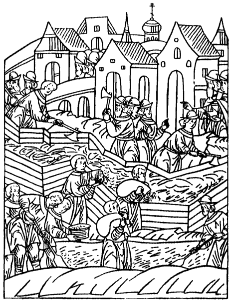 Борис Годунов повелел обнести деревянными стенами границы всех посадов Москвы для защиты от вражеских нашествий. Строительство было начато в 1591 году и закончено менее чем за год. Огороженную таким образом часть столицы назвали Скородомом или Скородумом. Поляки, захватив Москву, сожгли деревянные стены, но укрепление возродилось вновь в 1633–1640 годах уже в виде земляного вала со рвом и тыном. В одной из старинных летописей рассказывается о строительстве таких стен: «У града около валу рубиша кожух и землю насыпаша, того же лета и ров копаше глубле человека». Здесь же приводится рисунок, на котором видно, как плотники возводят две параллельные рубленые стены (кожух), в промежуток между ними работники засыпают землю, таская ее в деревянных ведрах и в мешках, с наружной же стороны кожуха деревянными лопатами копают ров.
