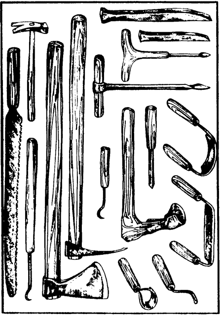 Это прежде всего плотницкие и столярные топоры, которые, заметим, мало изменились со временем. Перед самой войной при прокладке линии Московского метрополитена были найдены хорошо сохранившиеся топоры XVI века с топорищами из березы, дуба и ясеня. В отличие от современных эти топорища были прямыми и длинными, сама же форма железной части почти полностью была сходна с образцами тех же инструментов, обнаруженных в древних курганах и изображенных на рисунках в летописях XIII–XV веков.