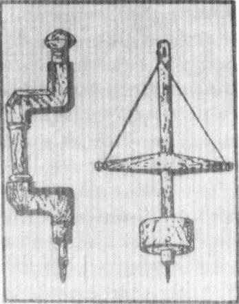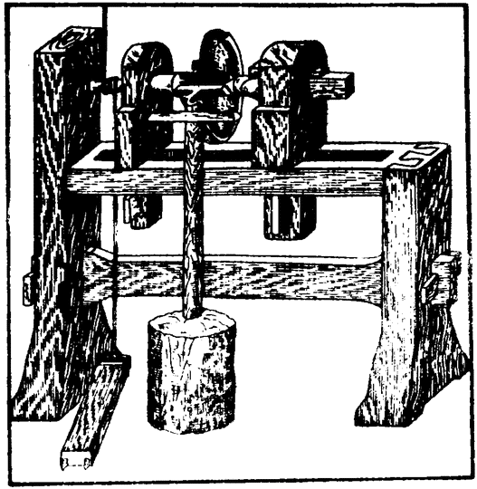 Когда говорят о токарном деле на Руси, обычно вспоминают А.К. Нартова — личного токаря Петра I, изобретателя и механика, много сделавшего по конструированию и усовершенствованию токарных станков, в частности, первым создавшего механизированный суппорт — приспособление для закрепления и перемещения резцов. Между тем история русских токарных станков началась намного раньше, по крайней мере, в XIII веке. На рисунке изображена реконструкция токарного станка XIII–XV веков, применявшегося для обработки дерева. Ось его, как и у описанной выше дрели, приводилась в движение лучковым приводом — ножной педалью, соединенной веревкой с балансиром. На таком станке вытачивали различную деревянную посуду, балясины для крылец и лестниц и многое другое.