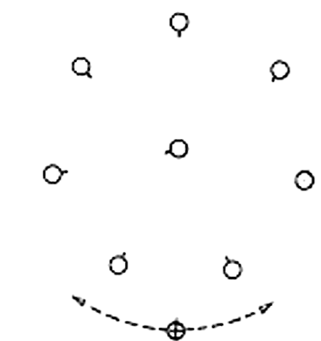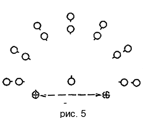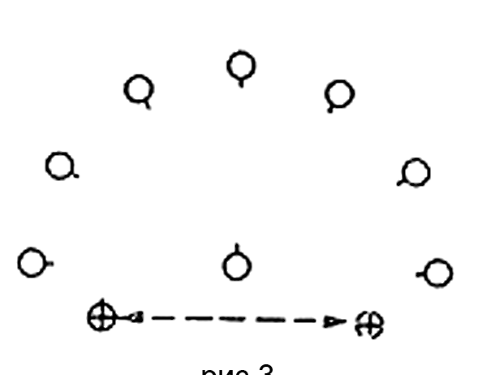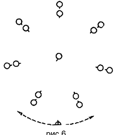 Наиболее простая форма; расстановки игроков в командных занятиях при наличии одного мяча – полукругом (рис. 3) или кругом (рис. 4). Если число игроков команды больше обычного, они образуют двойной полукруг (рис. 5) или двойной круг (рис. 6). Преподаватель при этих формах обучения должен менять место в направлении, указанном на рисунках.