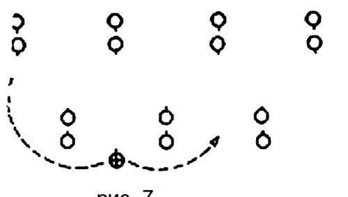 Если одна колонна сдвинута в сторону, то такой способ расстановки может быть хорош при выполнении упражнения в передаче в сторону, во время ведения мяча (рис. 10). Передавший мяч игрок встает в конец своей колонны.