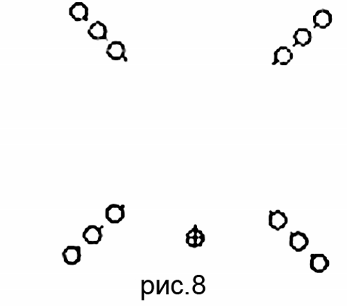 Для обучения передачам, ударам по мячу головой, приему мяча со стороны можно рекомендовать расстановку квадратом или волнообразной линией, а иногда и парами или по трое, как показано на рис. 7 и 8 (обратите внимание на место и направление движения преподавателя на отдельных рисунках).