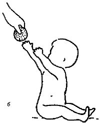 б – положение сидя. Ребенок начинает осваивать защитное движение – отводит назад прямые руки. Сидя, он прекрасно сохраняет равновесие и в опоре больше не нуждается. Как показано на рисунке, малыш сидя может легко повернуть туловище и обернуться, чтобы взять игрушку. Кроме того, в положении сидя он поворачивается «на попе» вокруг своей оси.