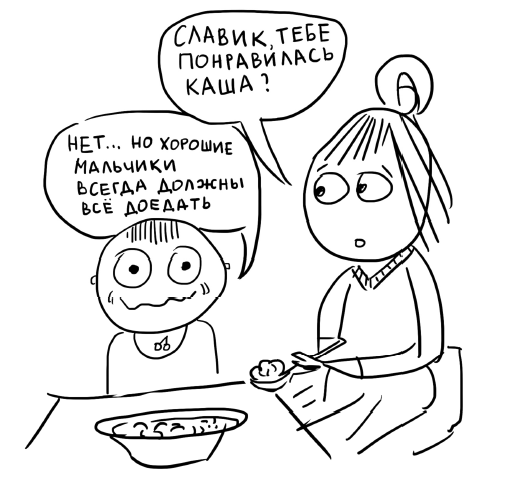 В свои три года Славик действительно не умел самостоятельно есть — не было у него такого опыта. И вот в первый день пребывания Славика в детском саду я кормлю его и наблюдаю полное отсутствие эмоций. Подношу ложку — он открывает рот, жует, глотает. Еще одна ложка — снова открывает рот, жует, глотает… Надо сказать, что повару в садике особенно не удавалась каша. Каша получалась «антигравитационная»: если перевернуть тарелку, то вопреки законам гравитации она так и оставалась в ней, прилипнув ко дну плотной массой. В тот день многие дети кашу есть отказались, и я их прекрасно понимаю. Славик съел почти все.