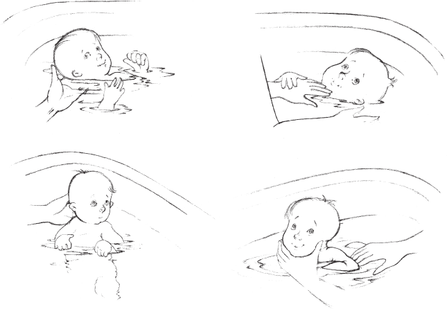 Итак, опускаем малыша в воду, всего целиком, чтоб из воды выглядывало только личико. Держать ребенка можно лишь за головку – мизинец под шеей, а остальные пальцы – под затылком. Чем больше погружена голова, тем лучше, и ничего страшного, если вода попадает в глаза, лишь бы нос и рот были на поверхности. Сразу же можно заметить следующее: туловище, которое вы совсем не держите, ко дну не опускается, а, напротив, всплывает. При этом грудная клетка и живот, как правило, торчат из воды. Поэтому второй рукой необходимо регулировать погружение туловища, чтобы и грудная клетка и живот полностью были под водой. Обращаю внимание – никакой опасности в том, что вода попадает в уши, нет![86]