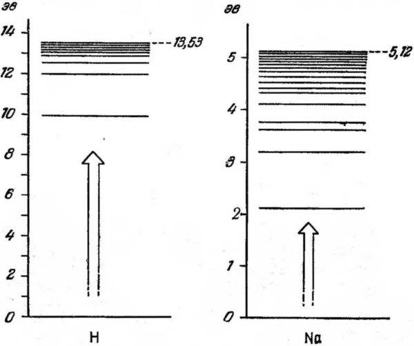 Рис. 23. Энергии квантовых состояний водорода Н и натрия Na.