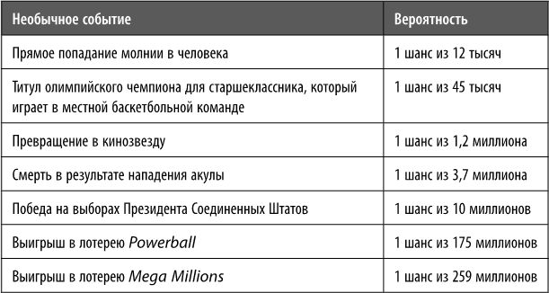 Если ваш ребенок думает, что лотерея – идеальный путь к богатству, покажите ему эту схему, иллюстрирующую вероятность выигрыша в лотерею, по сравнению с другими событиями.