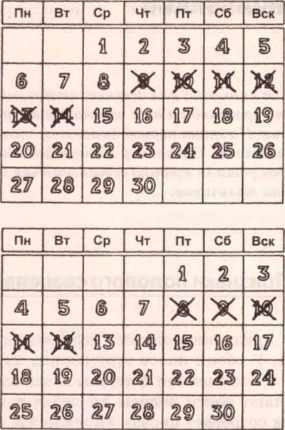 Для записи менструального цикла возьми вот такой календарь. У этой девочки первый день кровотечения был 9-го числа, и оно продолжалось еще пять дней, поэтому она отмечала все эти дни крестиками. Следующий цикл начался восьмого числа следующего месяца, и месячные продолжались пять дней, эти дни отмечены крестиками. Подсчитав количество дней между крестиками, ты сможешь узнать длительность своего менструального цикла. У этой девочки цикл длился 29 дней.
