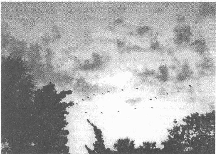 Стая пеликанов летит на остров Пеликан на реке Индиан-Ривер, Дейтон-Бич, шт. Флорида. Этот остров — самое северное в США место гнездования пеликанов, которые зимуют в Венесуэле. В 1907 г. по приказу президента США Теодора Рузвельта остров Пеликан стал первым в Америке заповедником дикой природы (фото автора).