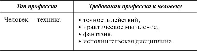 1. Профессии типа «человек – техника»: специалисты данной профессии должны обладать такими качествами, как точность, определенность действий при обработке, преобразовании, перемещении или оценке технических объектов. Большое значение приобретают практическое мышление, фантазия, способность мысленно соединять и разъединять технические объекты и их части.
