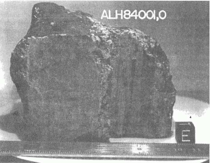 Этот фрагмент метеорита (названный SNC — «сник») впервые был представлен прессе на конференции NASA в августе 1996 г. Он был найден во льдах Антарктиды в 1984 г., более десятилетнего изучали, в результате чего обнаружили, что он является фрагментом марсианской коры, образовавшейся 4,5 млрд. лет назад, затем был выдавлен на поверхность планеты и примерно 16 млн. лет назад в результате удара астероида о ее поверхность был выброшен в космическое пространство. В породе находились, по-видимому, ископаемые остатки марсианских бактерий, и это позволяет предположить, что жизнь существовала не только на Земле. (Из материалов NASA.)