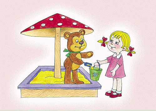 Задайте малышу вопросы по картинке: пусть малыш покажет, где кукла, где мишка, где песочница, что держит кукла, а что – мишка.