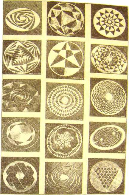Рис. 3. Подборка глиптов со сложной структурой. Эю геометрически композиции, но все еще круги со сложной внутренней структурой которая формируется сочетанием вращательного движения с линейным Ограничение изобразительных средств двумя тонами за счет уложенной или нетронутой растительности компенсируется разнообразными приемами, но практически для всех характерна осевая симметрия