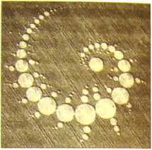 Давайте полюбуемся одной из красивейших фигур в истории Англии — глиптом Галактика (рис. 6), который появился утром 12 августа 2001 года все в том же Уилтшире на вершине холма Тэн Хилл (Tan Hill) совсем недалеко от всемирно известной фигуры "белой лошади". Накануне ночью шел сильный дождь, однако прибывшие исследователи не обнаружили на пропитанной водой земле ни одного следа ног человека, а также никакой грязи на дне кругов. Фигура состояла из шести дугообразных осей, на которых располагалось по 13 кругов, не считая центрального. Возле каждого такого круга по бокам на изогнутой траектории находилось от 1 до 3 малых кругов. Диаметр самого большого круга составлял 22, 6 метра, а самого малого — около 1,7 метра. В поперечнике размер изображения составлял 274,5 метра. Важно отметить, эта фигура была сформирована на созревших колосьях, потерявших свою гибкость, однако уложенные колосья не были сломаны, что не под силу выполнить человеку никакими ухищрениями.