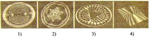 Рис. 5. Серия фигур на злаковых полях с демонстрацией: Силовых полей от двух и шести точечных источников (I, 2); силового поля формы (3); интерференционной картины двух полей (4)