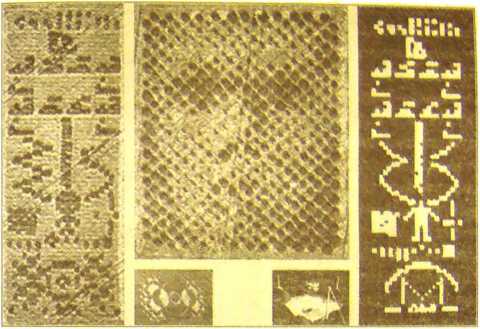 Рис. 7. Сравнение чилболтонских глиптов 2001 года (слева — послание, в центре — лик) с космическим посланием землян в 1974 году (справа) из радиоастрономической обсерватории США (г. Арссибо, Пуэрто-Рико). В центре внизу представлены чаша 300-метрового параболического радиотелескопа, условное изображение и диаметр которот представлены внизу земного сообщения (справа). Соответственно на аналогичном месте глипта расположена фигура, в которой узнаваем чилболтонский глипт 2000 года (слева)