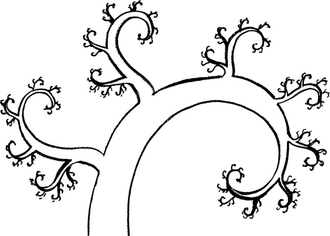 Дерево эволюции дает картину развития жизни на Земле. Продвижение по нему соответствует продвижению во времени. Каждое ответвление дерева означает развитие нового вида. Если ветвь заканчивается, это означает вымирание данного вида. Природа дерева такова, что его общая форма, как кажется, повторяется все в меньшем и меньшем масштабе. В этом и состоит характерная черта объектов, которые математики называют фракталами. В увеличенном виде любая малая часть дерева выглядит поразительно похожей на более крупные его структуры. Такое самоподобие означает, что понять, на каком масштабе мы рассматриваем дерево, очень трудно. Такова классическая особенность фрактала.