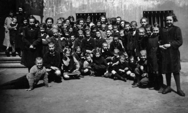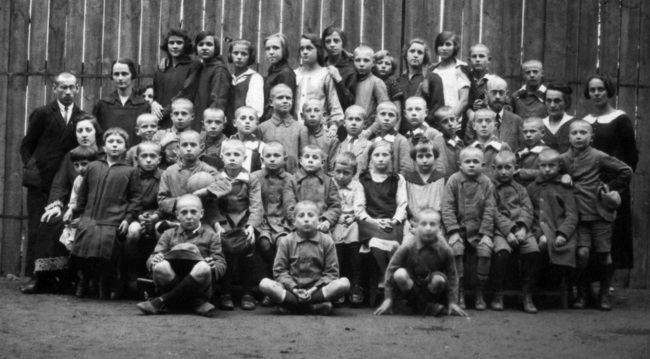 Дети с одним из учителей, Арье Бухнером. Дом сирот на Крохмальной, 92. 1930 г.