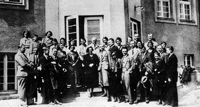 Группа руководителей детского дома «Наш дом». Януш Корчак перед входной дверью во втором ряду.