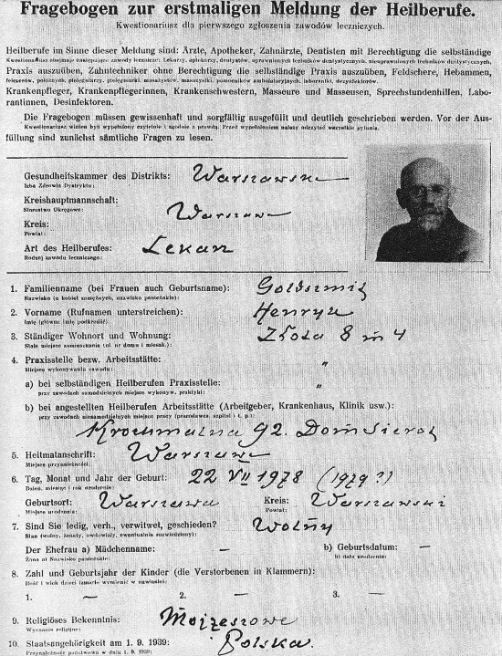 Личная карточка Януша Корчака (Хенрика Гольдшмита), выданная в процессе обязательной регистрации врачей немецкими оккупационными властями в Варшаве в 1940 г.