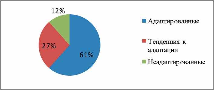 7 учащихся, что составляет 27 %, характеризуются тенденцией к адаптации. Рисунки менее богаты, чаще всего нарисовано только здание, напоминающее школу. Животных нарисовано мало, и нет второстепенных предметов (портфеля, парт, тетрадок и т. д.).