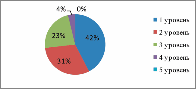 1 учащийся, имеют 4 уровень, что составляет 3,8 % от общей выборки исследований, который характеризуется низкой школьной мотивацией. Этот ребенок посещают школу неохотно. Испытывает серьёзные затруднения в учебной деятельности. Находятся в состоянии неустойчивой адаптации к школе. В рисунках на школьную тему он изображает игровые сюжеты, хотя косвенно они связаны со школой.