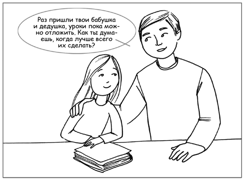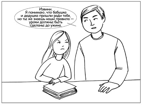Из этого, однако, не следует, что ни из каких правил не может быть исключений. В отдельных случаях вы можете даже закрыть глаза на нежелательное поведение детей. Скажем, у вас в семье действует правило: никаких электронных устройств во время еды. Но если во время дружеского застолья ваш четырехлетний малыш не сумел оторваться от новой игры и тихонько сопит над планшетом, собирая пазл, пока вы общаетесь с гостями, сделать исключение вполне позволительно. А может, дочь-школьница поклялась выполнять домашнее задание до ужина, но нежданно-негаданно нагрянули бабушка с дедушкой, чтобы с ней погулять. Почему бы на сей раз не заключить другой договор?