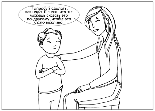 Например, время от времени можно воспользоваться приемом «сделай как надо». Вместо того чтобы сразу же наказывать ребенка за грубость, обратитесь к нему с таким предложением: «Не сомневаюсь, что если ты попробуешь еще раз, то сумеешь сказать то же самое вежливо». Прием «сделай как надо» дает ребенку второй шанс справиться со сложной ситуацией. Это возможность попрактиковаться в том, как нужно себя вести. Вы последовательно добиваетесь от ребенка соответствия вашим требованиям, причем значительно эффективнее, чем действуя по схеме «преступление = наказание».