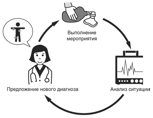 Цикл, описываемый Кристиансон, обычно начинается с реанимационного мероприятия, например интубации. Следующим шагом должен быть анализ: вы проверяете, дало ли мероприятие ожидаемый эффект. Если нет, то вы переходите к новому шагу – и выдвигаете новый возможный диагноз. Потом снова возвращаетесь к мероприятиям, ведь вы должны действовать – например, заменить лекарства или мешок респиратора, чтобы проверить свою новую идею.